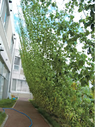二階屋上からネットを張り、日陰をつくることで室内の温度を下げ、二酸化炭素の排出量を抑える効果も狙っています。