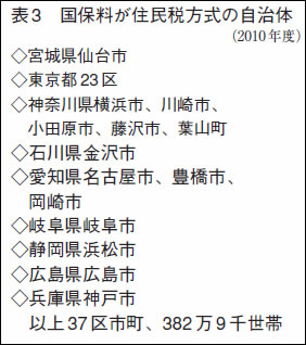 「旧但し書き方式」とは収入から基礎控除(三三万円)だけを差し引いて所得とみなし、国保料を算定するもの。収入から基礎控除、扶養控除、障害者控除な どを差し引いて所得とし、国保料を計算する「住民税方式」に比べ、扶養家族や障害者などを抱えている世帯ほど保険料が上がりやすい特徴があります。現在、 住民税方式は三七自治体と少数ですが、大都市に集中しており(表3)、影響は小さくありません。