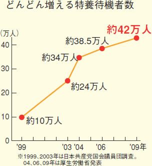 特養待機者42万人安心して介護受けられる基盤整備を介護保険施行から一一年。「介護の社会化」をかかげ、二〇〇〇年にはじまった介護保険ですが、「介護の社会化」にはほど遠く、介護が十分受けられなかったり、介護保険料や利用料が重荷となって、少なくない利用者、家族を苦しめているのが現状です。 利用を阻むハードル幾重も さらにサービス利用を阻むハードルが幾重にも存在していることが、問題をいっそう 深刻にしています。まず、要介護認定の申請が必要で、申請しても身体の状況に見合った要介護度が認められるとは限らない。そして要介護度ごとに限度額が決 まっており、必要な介護を受けているだけでも限度額をオーバーし、保険外負担が発生している人もいます。