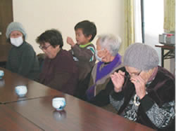 「ひまわりの会」ボランティア職員のお孫さんですが、二回目とあって参加者のみなさんとも顔なじみ。一人三〇回の肩たたきサービスに、笑顔があふれました。