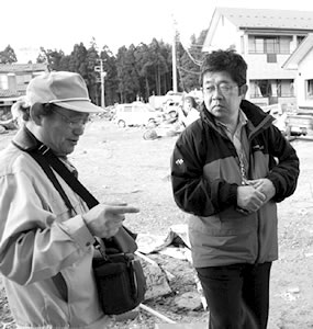 いちばん衝撃を受けたのが、坂総合病院の今田隆一院長に案内していただいた、東松島市野蒜(の びる)にある、松島医療生協「なるせの里」です。ここでは一一人のデイサービス利用者と三人の職員が犠牲に。二階建ての一階部分は無残に破壊され、階段の 二階近くまで津波のあとが残っていました。
