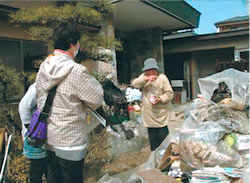 みなさんが復興に向けて後片付けに励んでいました。商店に何時間も並んで、わずかな食料を確保しながらの作業なので、水や食料、ホッカイロなどの支援物資はたいへん喜ばれました。