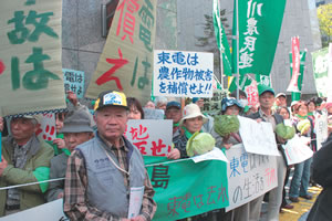 | 4月26日、東京電力本社前(東京都千代田区)にかけつけた農民たち。農作物をつくるよろこびと生活の糧を返せと抗議(写真=多田重正記者) |