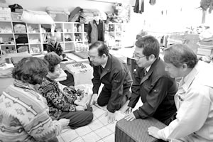 | 避難所で被災者の訴えをきく日本共産党・志位和夫委員長(右から3 人目)と筆者(同2 人目)。宮城・石巻市立湊小学校で |