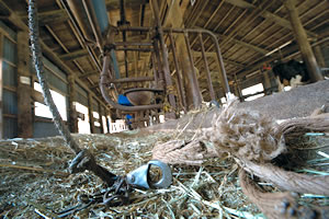 | 牛が屠殺処分で運び出された。牛をつないでいたロープだけが残された(5月8日、飯舘村蕨平) |