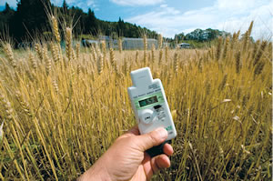 | 収穫できなくなった麦。放射線計は通常の130倍の毎時6.53マイクロシーベルトを示した(6月29日、飯舘村前田地区) |