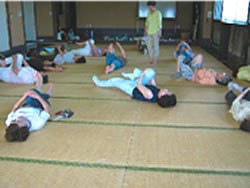 つばき支部はストレッチ体操を週一回、一時間半ほどおこないます。七年続いており、いまでは常時二〇人あまりが参加します。「腰痛がよくなった」と、長続きしている方も。