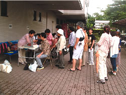七月二二日の会場は、さくら温泉入り口。三九人が訪れて行列ができ、友の会員たちはてんてこ舞いでした。事前に配布されたチラシの「入会申込書」を持っ てきて、「定期的な健診を受けるにはどうしたらいいか」と相談する方も。