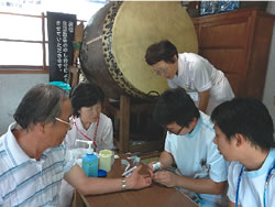 神社のお堂を借り、健康チェックのあとは医療懇談会。齋藤昌宏医師(吉田病院内科部長)に胃がんリスク検診について話していただきました。希望した方に は、胃がんリスク検診の採血も…。「1年目ナースはさぞ緊張?」と思いきや、にこやかに話をしながら堂々たるもので、頼もしい限りでした。