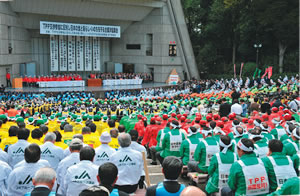 | 10月26日に開かれた東京・日比谷でのTPP反対集会には全国農業組合中央会(JA中央)のほか、日本医師会、漁業関係者、消費者団体など3000人が集まった |