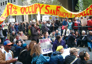 一一月五日、サンフランシスコ「占拠運動」恒例の「金融街めぐりデモ」に参加しました。一般市民や高齢者もまじって和やかな雰囲気です。一〇〇〇人近く にふくれあがったデモ隊は、金融街の目ぬき通り、マーケットストリートを埋めました。目的地は、ウェルズ・ファーゴ銀行本店。同行は二兆円を超す「救済 金」をもらい、最高責任者は二〇億円近い報酬を受けたというのだから驚きです。私もデモに加わって「金持ちこそ税金を払え!」と叫んでしまいました。
