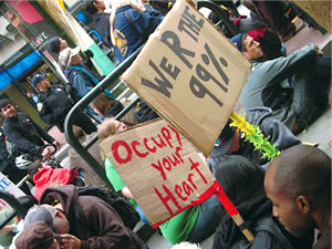 | 「我々は99%」の横断幕を掲げて銀行前で抗議行動をする人々(撮影:円道正実) |