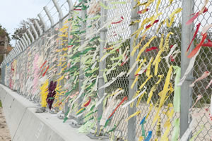 | 鉄条網が取りはらわれフェンスが立てられた辺野古の浜 |