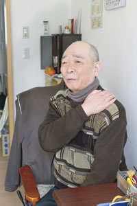 | 近田さん。膝を示しながら、「両膝に人工関節が入っている」と |