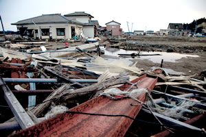 | 3・11から1年経った今も、倒壊した家屋やがれきが残る東松島市 |