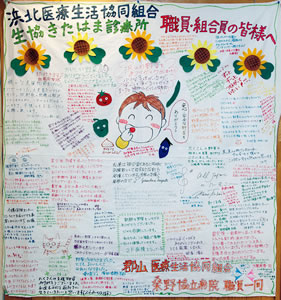 | 生協きたはま診療所の待ち合い室には、お礼がびっしり書かれた寄せがきが |