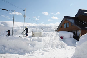 仮設暮らしに加えての大雪は、被害を拡大。一月六日、仮設住宅の雪下ろし中の栄村振興公社職員(41)が屋根から地面に転落して死亡。男性は野田沢地区 の自宅が被災し家族六人で仮設住宅に避難しており、雪が消えたら被災した住宅の再建を考えていた。「自宅の雪下ろしで疲れた後の仮設住宅の雪下ろしは無理 だった」と悔しそうに同僚は語った。