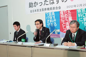 | 「無保険の人も多くいた」と全日本民医連長瀬文雄事務局長(中央。写真・編集部) |