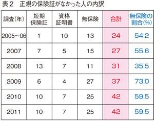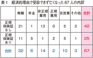 正規の保険証を持ちながら窓口負担が足かせとなって亡くなった人が二五人(表1)。正規の保険証がなかった人では、保険料滞納で国民健康保険の資格証明 書(医療費を窓口で一〇割払わなければならない)を発行されていた人が七人、保険証を持たない「無保険」も二五人と目立ちました(表2)。