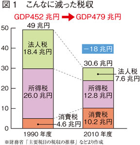 「大綱」は、消費税を二〇一四年四月に八%、二〇一五年一〇月に一〇%にまで引き上げるとしています。政府はこれを社会保障財源の安定のためと言いますが、事実は違います。実際には一九八九年の消費税導入後、日本の税収は減っています(図1)。日本の国内総生産(GDP)は増えているのに、税収が大幅に減っているのは、国が高額所得者や大企業の税金を引き下げてきたからです。