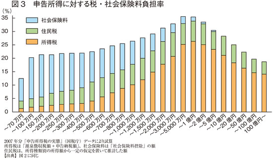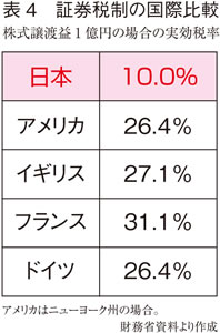 さらに「大綱」は「負担なくして受益はない」「年齢を問わず負担能力に応じた負担を」と豪語していますが、日本は、年収が一億円を超えると税金や保険料の負担率が下がる「お金持ち天国」です(図3)。株の売買や配当にかかる税金を、〇三年から一〇%(本来二〇%)に引き下げたことなども影響しています(表4)。社会保障の財源不足を言うなら、消費税増税ではなく大企業や富裕層の優遇をまずやめるべきです。