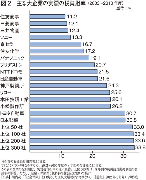 大企業の中には極端に低い税金ですんでいるところも(図2)。研究開発減税(減税されている九割以上が資本金一〇億 円以上の大企業)、外国子会社配当益金不算入制度(海外子会社からの配当は九五%非課税)などの恩恵を受けているからです。ところが経団連は消費税増税を 政府に求める一方で、「早期に法人実効税率を…三〇%まで引き下げ」るよう要望しています(「平成二四年度税制改正に関する提言」二〇一一年九月)。