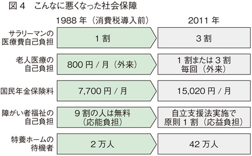 消費税導入後も悪くなる一方の日本の社会保障制度(図4)。 「『一体改革』は『能力に応じて負担し、必要に応じて受けとる』という、社会保障の理念を変質させ、『解体』するものです。“消費税を社会保障目的税にす る”と政府は言いますが、そうなれば国民は、『社会保障をよくしたいなら消費税増税、増税が嫌なら悪い社会保障で我慢しろ』という二者択一を迫られること になる」と相野谷さん。「『一体改革』の中身を広く国民に知らせ、民主党政権を解散に追い込んで、国民の信を問うべきです」と強調しました。