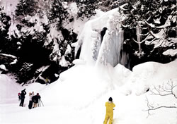 会員一二人が参加し、雪道を二時間ほど歩いて到着。見事に凍った二の滝を見上げながら、感激したり写真を撮ったり、オン・ザ・ロック用の氷をとったりと、氷の造形を充分に堪能することができました。