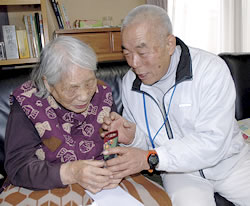 「小説が大好き」という86歳のHさんは、ラジオ体操を毎日欠かさずやっているそうで、屈伸をしたら手は床にペタンとつき、頭は膝にピタッとつきます。 「困っていることは?」との問いに、「何もないのよ。いつも笑って暮らしています」と。私たちの訪問を「福を運んでくれてありがとう」と喜んでくれまし た。