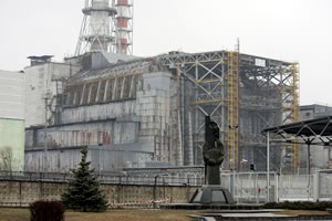 さらにバスで走ると、チェルノブイリ原発が見えてきました。爆発を起こした四号炉前の広場では線量が高く、今でも八・五~八・九マイクロシーベルト(毎 時)を計測。年間に換算すると約七四~七八ミリシーベルトになります。国際原子力機関が示す人体の被ばく許容線量は年間一ミリシーベルトですから、たいへ んな放射線量です。現在、爆発した四号炉をコンクリート詰めにした「石棺」が老朽化して、新たな放射能漏れが問題となっているため、二度目の石棺工事が始 まっており、二〇一五年までに完成する予定。チェルノブイリ原発は最後まで稼働していた三号炉の停止(二〇〇〇年)後も、多くの作業員が働いているので す。