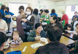 この度、医学生20人といっしょに、仮設住宅を訪れました。入居者にあんこ餅と雑煮を振る舞い、大変喜ばれました。たこ揚げには、春休み中の子どもたちから歓声があがりました。