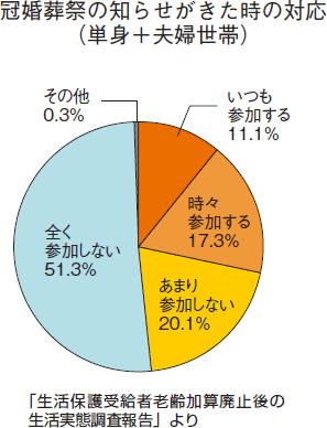 さらに、六割の世帯が「教養・娯楽費〇円」で、冠婚葬祭の案内が来ても「まったく出席しない」世帯が半数を超えるなど、驚くような結果。「水を飲んで空 腹をしのぐ」「風呂はお湯の量を減らし、三~四日に一度しか入らない」「もらった服を直して着ている」「交際費が出せないので、つきあいを減らした」など の生活実態が浮き彫りになりました。