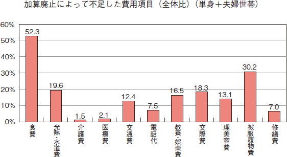 老齢加算廃止後の厳しい生活実態は、全日本民医連ソーシャルワーカー委員会の調査(「生活保護受給者老齢加算廃止後の生活実態調査報告」二〇〇八年発 表)でも裏付けられています。「一日三食の食事がとれない」生活を送る世帯が二割を超え、衣類や靴などを「この一年まったく購入していない」世帯も四割を 超えました。
