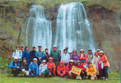サークル「健歩会」の今年度第一回目は、郊外にある公園の滝めぐりでした。六カ月ぶりの再会に「元気だった?」「お孫さん大きくなったでしょう」「ことし も休まず、一〇月まで歩きましょうね」など、会話も弾みます。霧雨をものともせず、参加者は健脚ぶりを発揮していました。