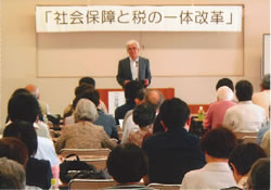 二宮厚美・神戸大学教授を招いて、「社会保障と税の一体改革」についての講演会を開きました。組合員と職員あわせて130人が熱心に耳を傾けました。