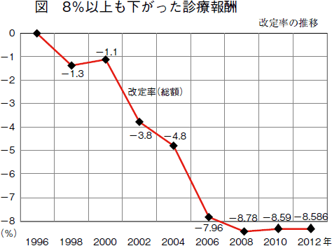 損税について、厚労省は「診療報酬(医療保険で定められた医療行為の対価)で手当てしている」と説明しています。確かに消費税三%導入時(八九年)に 〇・七六%、五%への増税時(九七年)に〇・七七%が診療報酬に上乗せされました。しかし、「その後マイナス改定が連続して約八%も診療報酬は下がってい ます。上乗せされた項目自体なくなっているものもある。上乗せ分なんてすでに消えている」と千坂さんは指摘します。