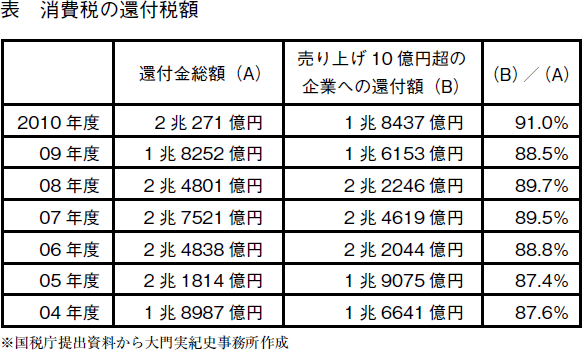一方で、製品を外国で売り上げる企業には、「輸出先で消費税を転嫁できないから」という理由で、仕入れにかかった消費税が還付されています。輸出戻し税 と呼ばれるこの制度で還付されている額は、輸出大企業を中心に約二兆円(表)。これらの企業との公平性の観点からも、医療機関に負担させる損税には道理がありません。