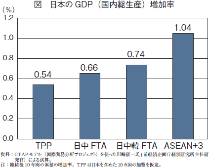 「得るものは最低、失うものは最大」というのがTPPです。TPPで伸びる日本の国内総生産(GDP)は一〇年間積算で約〇・五%、一年あたり〇・〇五%(二七〇〇億円)で、誤差の範囲にすぎません(図)。日中韓間の自由貿易協定(FTA)やASEAN(東南アジア諸国連合)に日中韓をくわえた一三カ国のFTAと比べても低いのですから、誰がどう見てもTPPは最悪の選択肢です。
