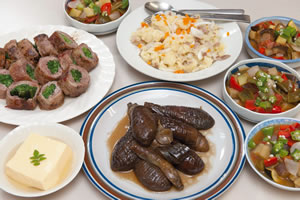 この日のメイン食材は旬のなす。なすの田舎煮、ラタトゥイユ(野菜煮込み)のほか、にらの豚肉巻き焼き、ジャーマンポテトサラダ、卵豆腐という豪華なメニューです。