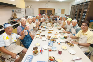 七月一四日午後五時、五〇代から七〇代の一八人の男性が医誠会診療所の二階に集いました。おそろいのエプロンに身を包み、調理師の甲元友子さんの説明に耳を傾けます。