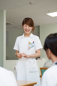 | 「うちの病院は子育てしながらでも働きやすいですよ。ぜひいっしょに働きましょうね」と、高校生に話す入江順子看護師。 |