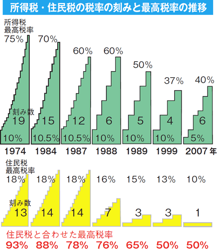 いまの日本の税制のもとになったシャウプ勧告(一九五〇年)には、直接税を中心とした応能負担(能力に応じた負担)の原則が書き込まれていました。しか し、それは国民のたたかいで勝ちとった原則ではないために、どんどん形骸化され、改悪されつづけてきました。これからは「たたかって国民の権利を守り、勝 ちとる」時代にしていかなければなりません。