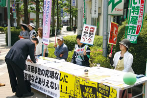 市外の諫早市、大村市、南島原市から参加する人たちもあらわれました。さらに八月三一日には、諫早駅前でも行動開始。一般市民がツイッターで呼びかけた のが始まりで、第一回目の参加者は四〇人ほど。「ファジー(柔軟)でほのぼのとして笑顔いっぱい!」との感想が寄せられました。「長崎連絡会」では、九州 玄海原発の差し止め訴訟も支援。原発がゼロになる日まで、全国の仲間と連帯し、被爆地・長崎から「ノーモア被爆者、ノーモア原発!」の波が大きなうねりと なるようアクションを続けていきます。