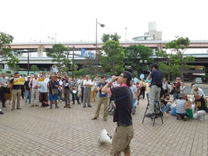 午後六時から七時半まで夕暮れの街に、思い思いのプラカードや手書きのポスターを掲げ、小さい子どもを連れた若いお母さんや職場の仲間が参加していま す。フルートやギターを使って、音楽や歌で市民にアピールする方もいます。