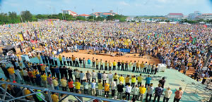 | 民主党政権の裏切りに抗議し、普天間基地の県内移設の結論に抗議する沖縄県民大会。9万人が集まった(2010年4月、読谷村) |