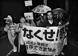 「原発いらない」「子どもを守ろう」と、タンバリンなどのリズムにのって行進。お店や住宅の窓から覗く人や、手を振ってくれる通りがかりの人もいまし た。解散地点での参加者は八七人。「原発をなくすまで、運動を続けよう」と当友の会の千葉勝利・事務局長が訴えました。