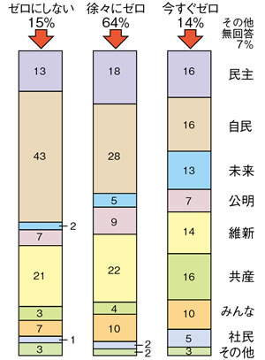 さらに言えば脱原発の票は、かなり分散しています。「朝日」の出口調査では、原発を「今すぐゼロ」と思っている人でも、投票先は民主一六%、自民一 六%、共産一六%、維新一四%、未来一三%、みんな一〇%といった具合です。実際に脱原発をすすめるのがどういう政党なのか、この点の判断が一致していま せん。原発推進の政党や候補者による「争点隠し」の影響も大きかったと思います。脱原発のとりくみは、今後、こうしたハードルを越えていかねばなりませ ん。