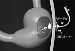 「出すための胃ろう」はがんなどで腸や胃の出口がふさがり、腸閉塞や胃拡張の状態になった方に対しておこないます。胃や腸にたまった内容物を体外に排泄 して、口からの食物摂取を可能にする「減圧胃ろう」とよばれます。進行したがんの方の苦痛の症状をとるのに有効です。