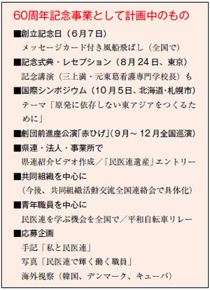 柳沢 民医連の存在意義や歴史を振り返り、職員・共同組織みんなで確信にしあうために、六〇周年記念事業実行委員会では自分と民医連のかかわりを振り返る手記の募集や、「民医連遺産」エントリーなども計画しています(表)。
