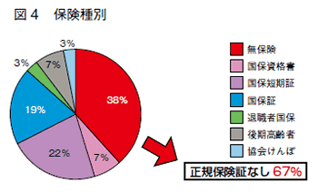 「しかも今回の調査では、“四〇~六〇代の働き盛り”の世代の事例が八一%にも及んでいたのが特徴(図3)です。国保加入などの手続きをしていない無保険の方、短期保険証、資格証明書(表)の方が六七%もいた」と強調します(図4)。